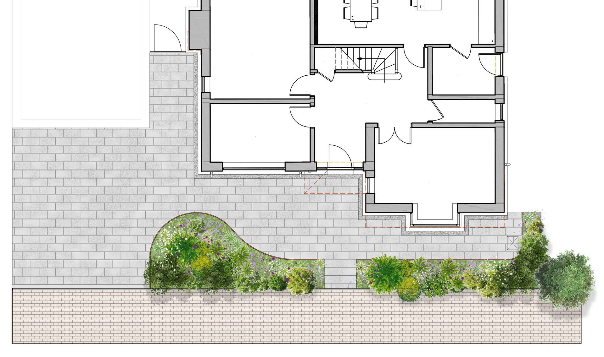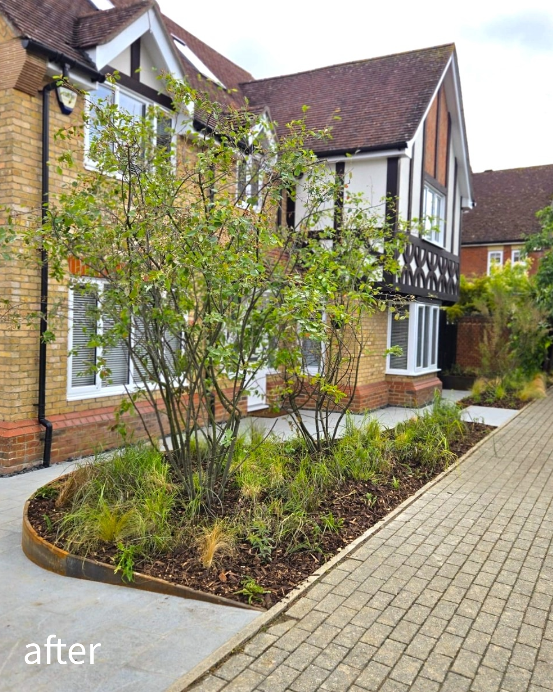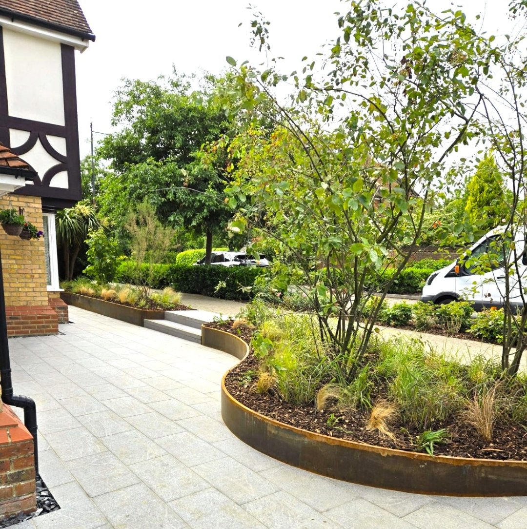 The original timber sleepers have been replaced with curved corten steel planters, introducing organic form and a warm, modern character.