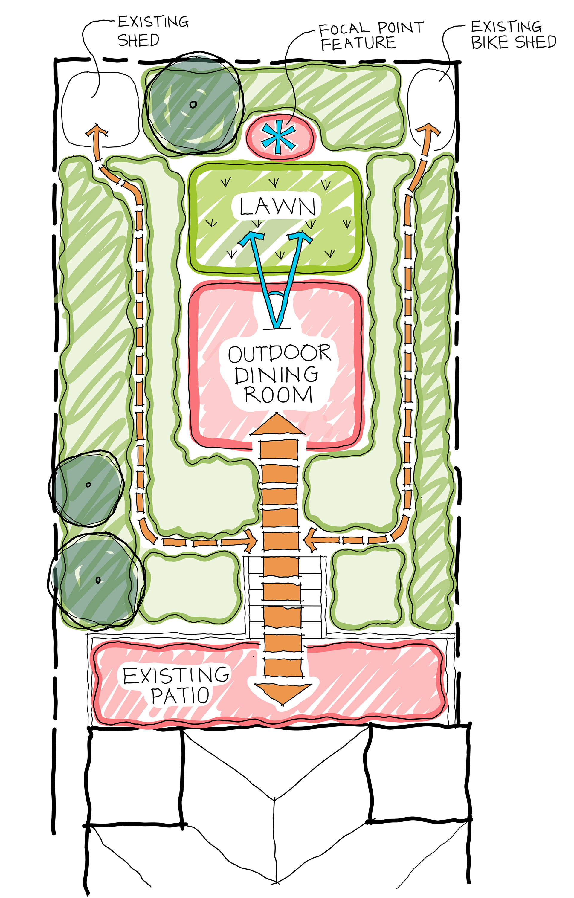 A timber trellis structure with evergreen climbers, frames a central al-fresco dining area providing privacy, enclosure, and year-round greenery. Only a small portion of the original lawn has been retained, giving the dogs space to play while allowing the majority of the garden to flourish as a naturalistic sanctuary.