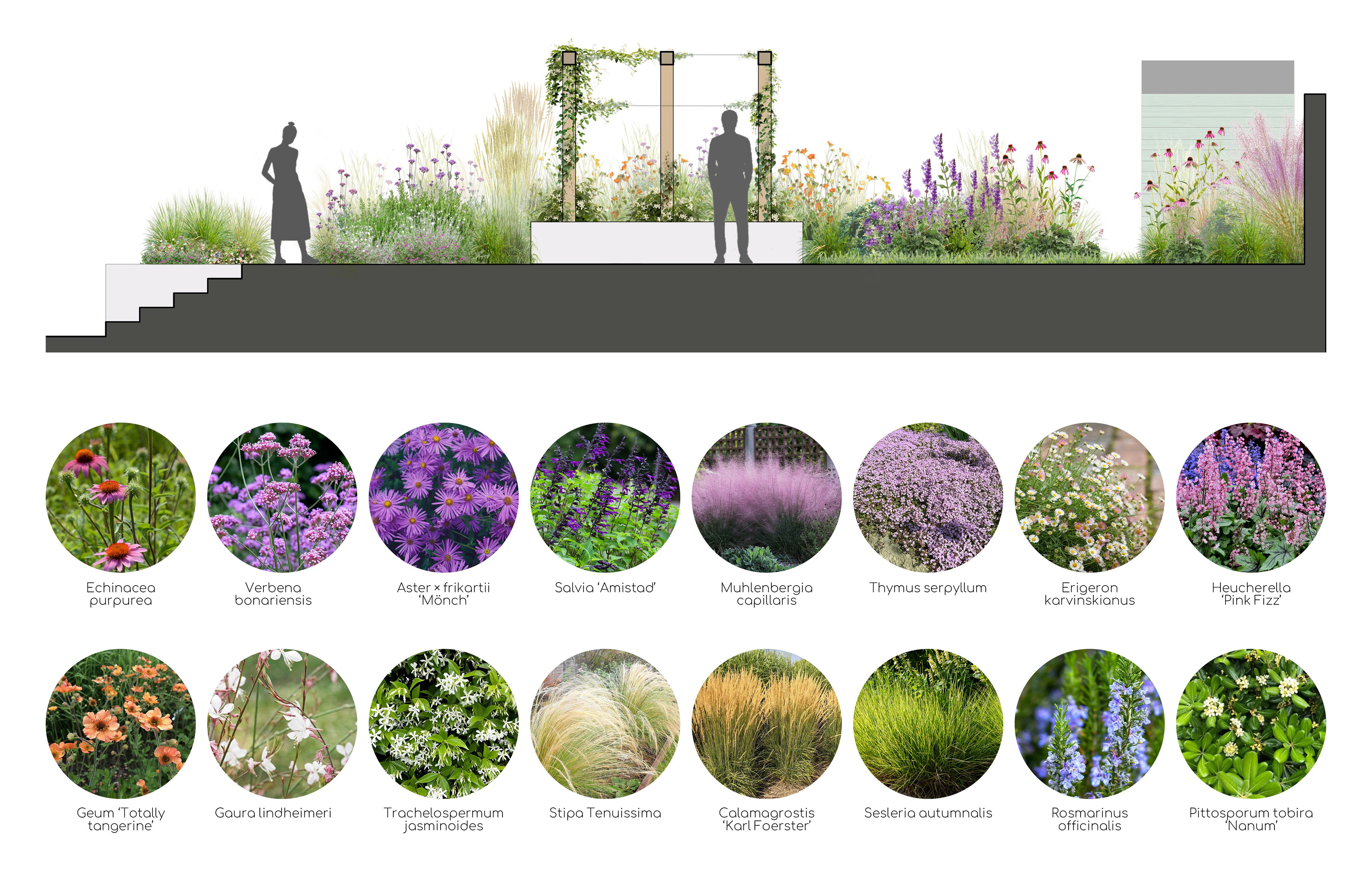 The planting palette features pollinator and dog-friendly species with a long flowering season, ensuring colour and ecological value from spring through autumn. Layers of perennials, ornamental grasses, and resilient groundcovers create a dynamic tapestry that is both durable under paws and rich in habitat for bees and butterflies.